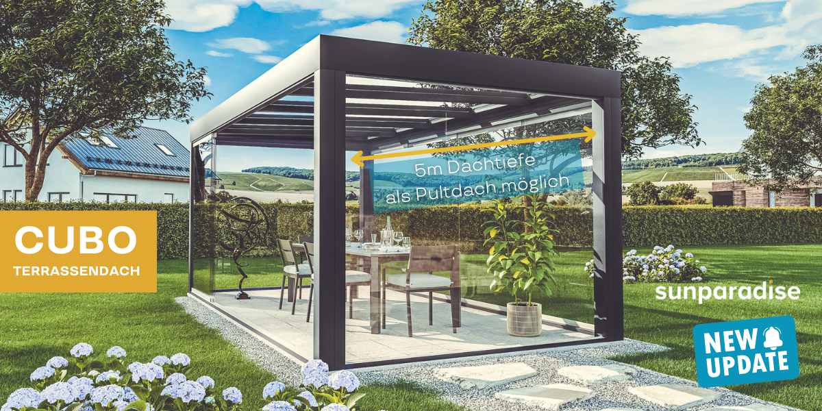 We are very pleased to inform you about the market launch of our extended CUBO terrace roof. With its clear cubic shape, the CUBO flat roof solution fascinates not only at first glance - but at every other time. Whether placed free-standing or attached to the residential building, the high-quality construction convinces with solid workmanship and superior elegance. 😊